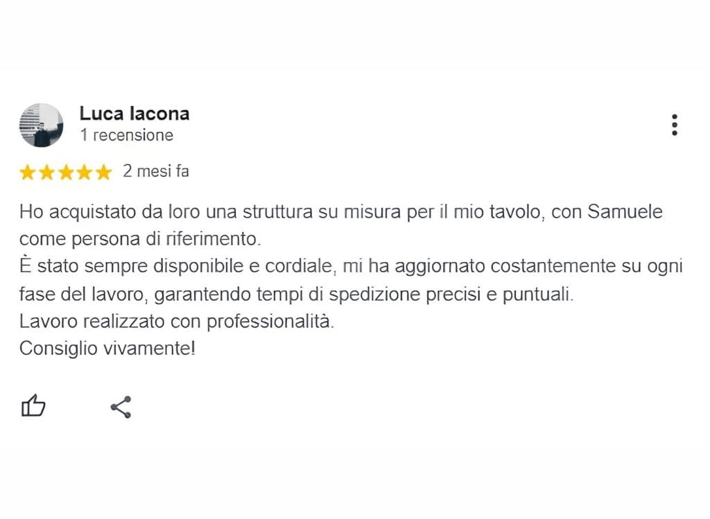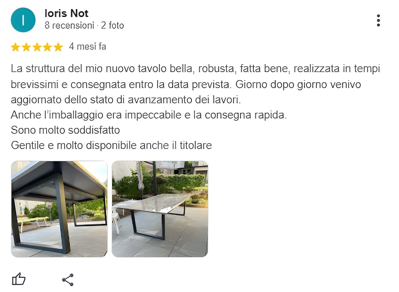 Super soddisfatti del nostro basamento per tavolo! Dopo aver visto i modelli sul sito Decimus, abbiamo scelto una struttura su misura per un top in grès da 220×110 cm: solida, sicura e senza ingombro centrale. Samuele ci ha seguiti passo dopo passo fino alla consegna. Professionalità e convenienza impeccabili!