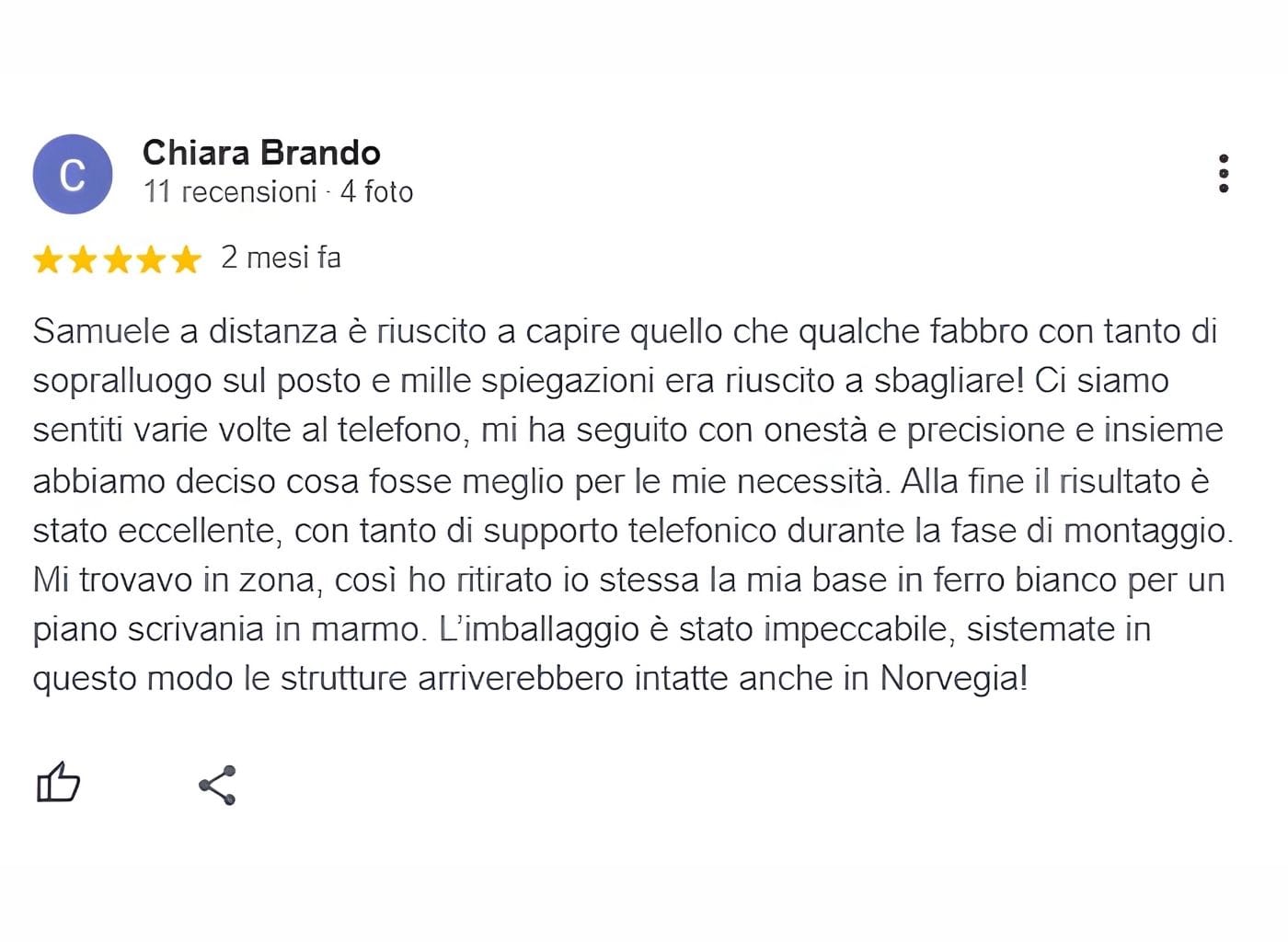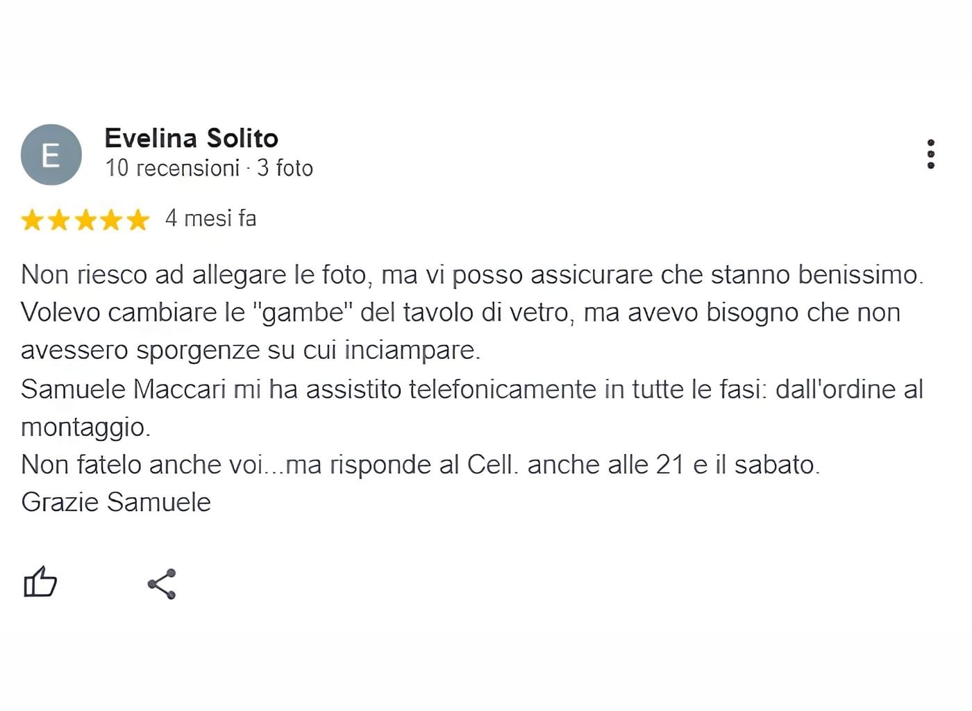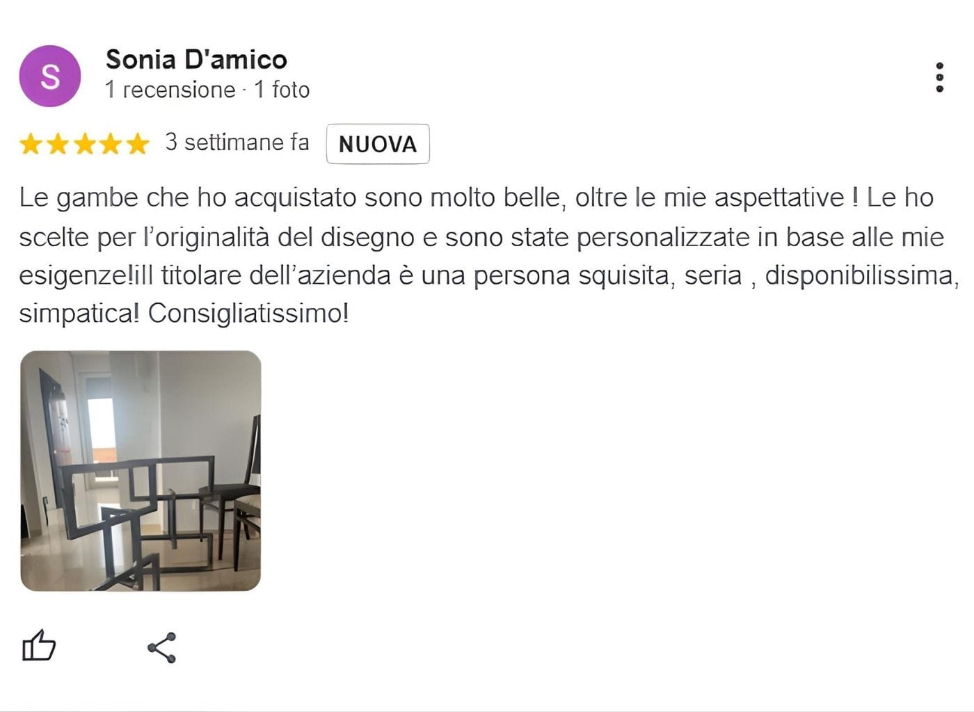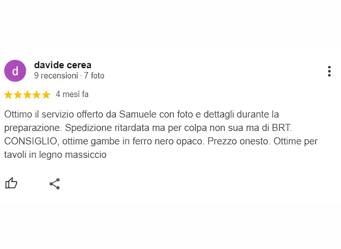 Evelina SolitoNon riesco ad allegare le foto, ma vi posso assicurare che stanno benissimo. Volevo cambiare le "gambe" del tavolo di vetro, ma avevo bisogno che non avessero sporgenze su cui inciampare. Samuele Maccari mi ha assistito telefonicamente in tutte le fasi: dall'ordine al montaggio. Non fatelo anche voi...ma risponde al Cell. anche alle 21 e il sabato. Grazie SamueleTrustindex verifica che la fonte originale della recensione sia Google. Francesco CostaBellissima esperienza, Samuele mi ha seguito passo passo mentre effettuava la lavorazione con foto o messaggi e apportando modifiche all’ordine di mio gradimento. Come faresti con un amico. Lo super-consiglio.Trustindex verifica che la fonte originale della recensione sia Google. Vittorio ColmoHo comprato una cucina Scavolini (che delusione il servizio clienti) da Aurelia Arredamenti di Roma (da evitare come la peste) ed ho ricevuto una gamba in metallo per il piano snack di misura sbagliata; nonostante le mie richieste di sostituzione della gamba, da oltre 4 mesi sia Aurelia Arredamenti che Scavolini mi hanno abbandonato con il solito "le faremo sapere" o anche senza rispondere alle mie mail. Stanco di essere preso in giro, ho trovato Decimus su internet ed ho chiesto loro se potevano farmi una gamba proprio come quella che avevo ordinato da Scavolini. Mi hanno seguito subito con cortesia e precisione nel progetto della gamba, definendo tutti i dettagli insieme, il preventivo, spese di spedizione comprese, è stato ben al di sotto del prezzo di Scavolini e il risultato finale è stato perfetto e veloce. in una quindicina di giorni hanno risolto il problema che Scavolini e Aurelia Arredamenti non hanno voluto risolvere, ho ricevuto a casa la gamba l'ho montata ed è venuta benissimo. Pertanto professionalità, cortesia, precisione e velocità ai massimi livelli. Ottimo lavoro Decimus!Trustindex verifica che la fonte originale della recensione sia Google. davide cereaOttimo il servizio offerto da Samuele con foto e dettagli durante la preparazione. Spedizione ritardata ma per colpa non sua ma di BRT. CONSIGLIO, ottime gambe in ferro nero opaco. Prezzo onesto. Ottime per tavoli in legno massiccioTrustindex verifica che la fonte originale della recensione sia Google. loris NotLa struttura del mio nuovo tavolo bella, robusta, fatta bene, realizzata in tempi brevissimi e consegnata entro la data prevista. Giorno dopo giorno venivo aggiornato dello stato di avanzamento dei lavori. Anche l’imballaggio era impeccabile e la consegna rapida. Sono molto soddisfatto Gentile e molto disponibile anche il titolareTrustindex verifica che la fonte originale della recensione sia Google. Antonio PinzoneBellissimo lavoro e ottima comunicazione!Trustindex verifica che la fonte originale della recensione sia Google. Silvia BaldiGambe per tavolo ottime. Il venditore gentile e preciso.Trustindex verifica che la fonte originale della recensione sia Google.